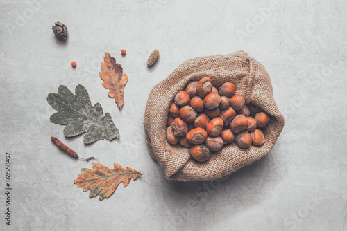 topview, hazelnut, shell, environmentally, burlap, sack, rustic, wooden, table, decorated, dark, autumn, fall, leaf, branch, pine cone, overhead, nut, fruit, food, raw, vegetarian, healthy, diet, jute, hessian, bag, wood, desk, season, nature, nobody, ripe, no people, low key, filbert