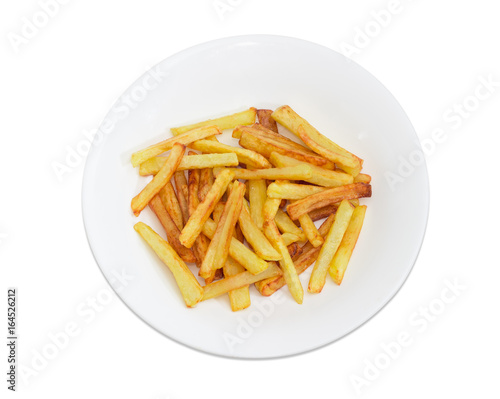 Top view of the French fries on the white dish