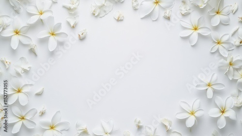 Top view of vibrant Plumeria flowers against a white backdrop, leaving plenty of open space for text or creative additions