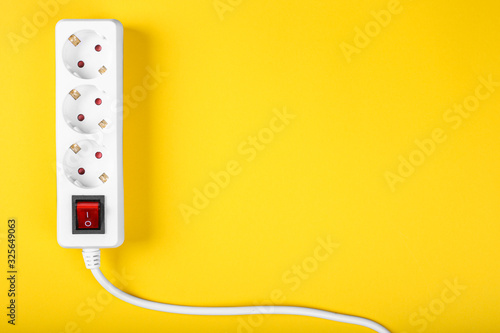 Top view of white strip or extension block on yellow background. High-tech smart strip, copy space