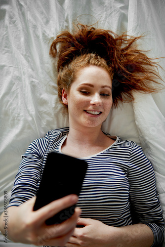 selfie, redhead, mobile phone, woman, topview, bed, missy, quarantine, living room, domestic life, indoor, technology, happiness, cheerful, bored, chilling, relaxation, posing, cyberspace, wide, front view, one person, connection, real people, avocation, wireless technology, attractive woman