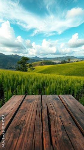 Top view of wooden table with hazy rice plantation and cloudy blue sky, blurred, cloudy sky, panorama, agriculture, serene