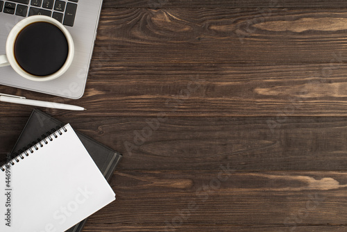 Top view photo of cup of drink on grey laptop white pen two black and white organizers on isolated dark wooden table background with blank space