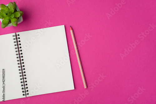 Top view photo of workplace with plant pencil and open organizer on isolated pink background with copyspace