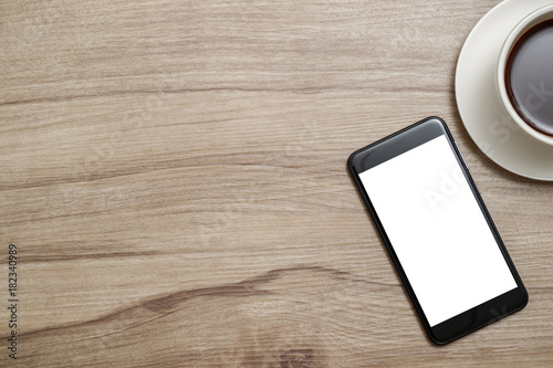 Top view with smartphone and a cup of coffee on wood desk. Copy space for text.