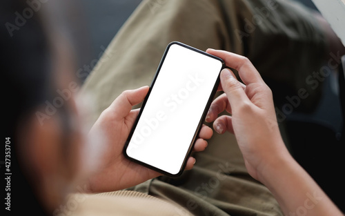 Top view Woman sitting and holding blank screen mock up mobile phone.