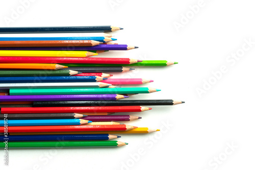 Top views of Color pencils isolated on white background.Close up.