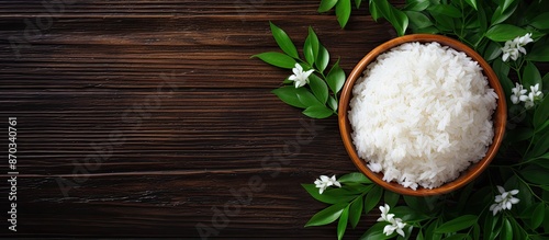 Top-down perspective of Jasmine rice displayed on a dark wooden surface among lush green plants, featuring jasmine rice served in a wooden bowl with copy space image.
