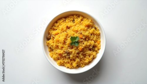 Top-down view Indian moong dal khichdi. Soft, flavorful rice lentil blend with ghee cumin. Comfort food in white bowl on plain white background. Traditional Indian cuisine dish.