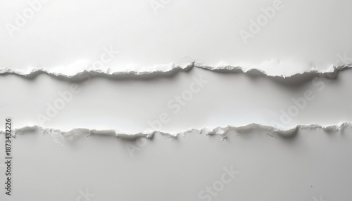 Torn white paper texture shows rough edges. Abstract background displays ripped page. Minimalistic backdrop textured effect. Design element allows text integration. Perfect blank area for message