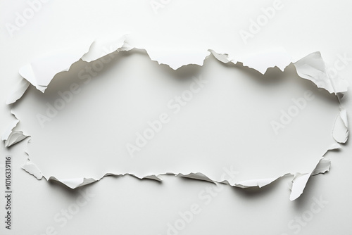 Torn white paper with rough, irregular edges on a smooth white background, creating a frame-like appearance with negative space in the center.