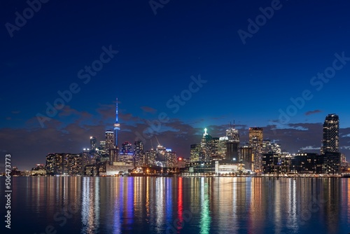 toronto, skyline, canada, canadian, night, cn, tower, blue, architecture, building, business, city, city landscape, colours, colourful, downtown, dusk, evening, financial, harbor, horizontal, lake, landmark, light, modern, office, lake ontario, panorama, panoramic, silhouette, sky, skyscraper, sunset, tall, travel, twilight, urban, water, waterfront