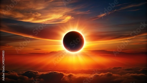 Total solar eclipse casting a mesmerizing shadow on a red orange sky during the early morning, total, beauty, cosmic, celestial event, horizon, astronomy, silhouette, solar