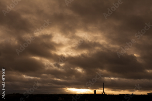 eiffel tower, paris, capital, france, cloud, weather, dark, laden, heaven, silhouette, light, breakthrough, cloudy, stormy