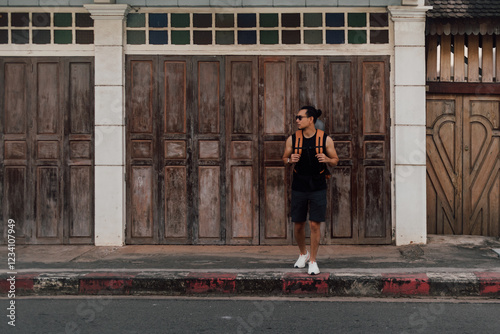 Tourist backpacker man crossing street in local Asia old town.