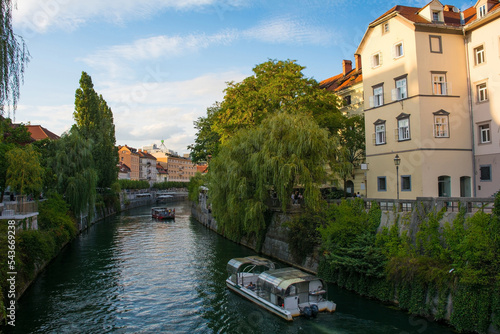 Tourist boats pass along the Ljubljanici River in central Ljubljana, Slovenia. The Fishmarket Footbridge can be seen in the background