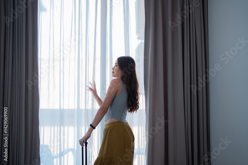 Tourist opening curtains in a hotel room, gazing out the window while gripping the suitcase handle, savoring the stunning view and embracing the excitement of the vacation