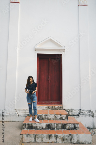 tourist woman a photographer stand in temple in traveler in vacation in Thailand nan province