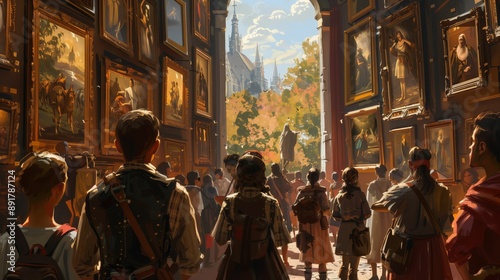 Tourists admire artwork in a grand gallery, filled with paintings, under a bright sky with an impressive cathedral in the background.