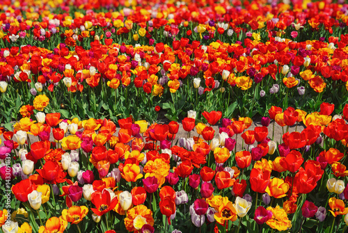 Tourists view famous tulip fields in the Netherlands. Beautiful tulip fields in spring