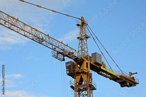 crane, tower, construction, tall, industry, equipment, steel, yellow, machinery, development, technology, engineering, heavy, machine, urban, structure, architecture, industrial, sky, site, business, lifting, high, blue, lift, building, hoisting, iron, metal, winch, work, city, load, nobody, project, object, cable, big, cabin, frame, vertical, up, hoist, activity, build, isolated, exterior, large, tower block