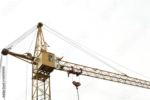 Tower crane under cloudy sky, low angle view. Construction site