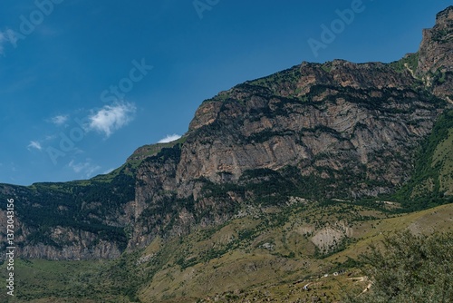 Towering cliffs rise dramatically in Northern Ossetia, surrounded by vibrant greenery and a serene blue sky, highlighting the region's natural beauty and geological diversity