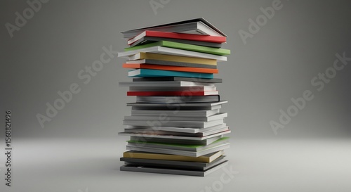 Towering Stack of Colorful Books on Neutral Background, Education Concept