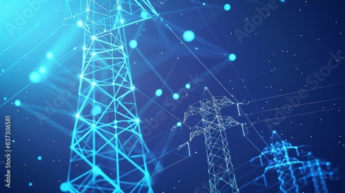 Towers of power lines are depicted with a polygonal design of lines and dots against a blue background.