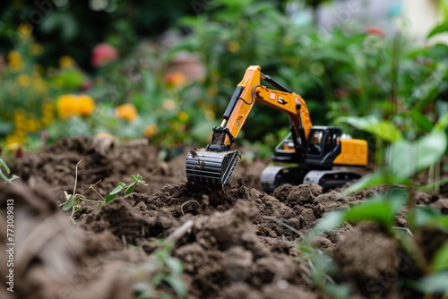 toy excavator in a garden digging through the soil