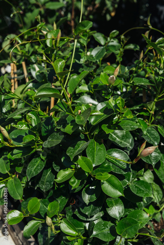 leaf, green, foliage, plant, nature, garden, botany, botanical, fresh, lush, vibrant, ornamental, decorative, shrub, bush, climbing, vine, star, jasmine, macro, summer, season, growth, natural, leafage, bright, detailed, shiny, glossy, texture, agriculture, horticulture, cultivation, cultivated, farm, tropical, fragrant, floral, blooming, greenery, landscaping, sunlight