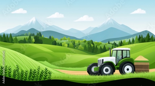 Tractor Driving Through Lush Green Hills with Majestic Mountains in Background on a Sunny Day