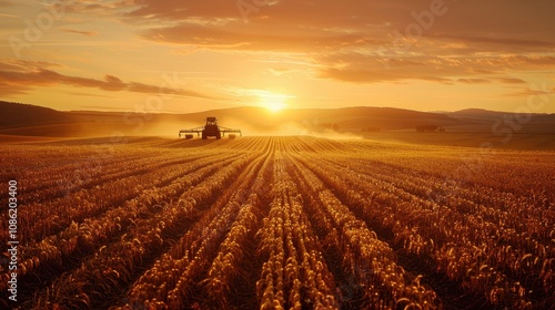 tractor, field, sunset, gold, wheat, agriculture, farming, harvest, rural, landscape, sky, cloud, sun, ray, summer, evening, dusk, horizon, countryside, farmland, crop, grain, stalk, dirtied, row, line, nature, scene, scenic, beauty, picturesque, serenity, calm, peaceful, tranquil, majestic, huge, expansive, yellow, orange, brown