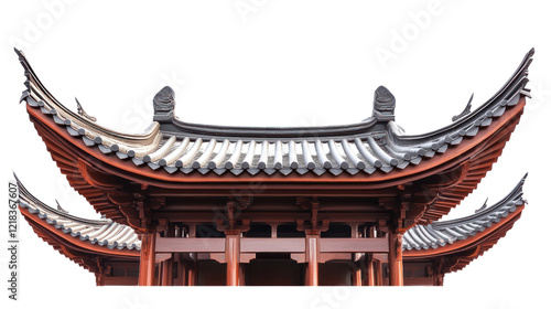 Traditional Asian architecture featuring intricate roof details and elegant design elements against a clean white background.