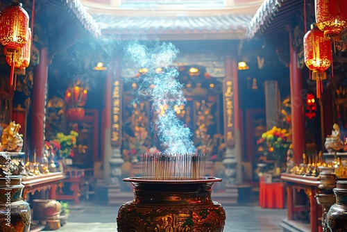 Traditional Asian Temple Interior with Incense Burning and Red Lanterns