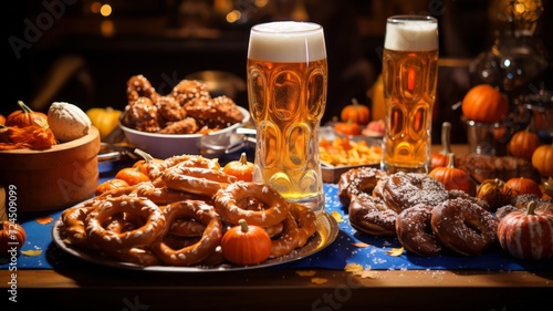 Traditional beer feast with pretzels and wheat, captured in a lively oktoberfest tent