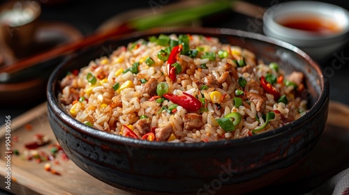 Traditional chinese grilled rice blends served in a rustic bowl with fresh ingredients