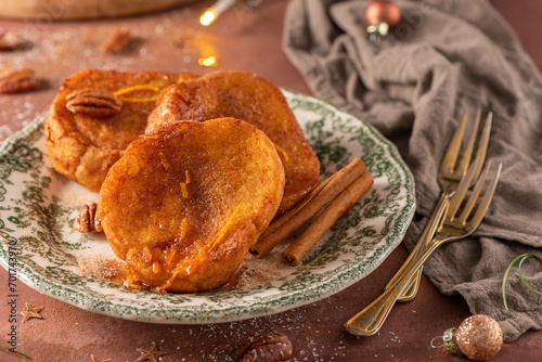 Traditional Christmas french toast or rabanadas with sugar syrup, cinnamon and pecan nuts on a rustic kitchen counter at Christmas time.