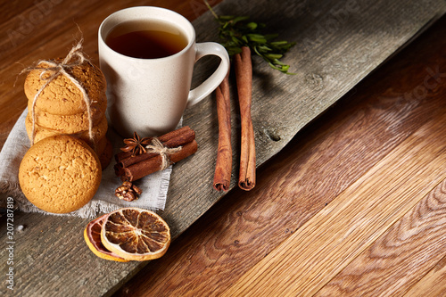 Traditional Christmas tea concept with a cup of hot tea, cookies and decorations on a wooden table, selective focus