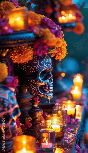 da, altar, sugar, skull, marigold, garland, candlelight, tradition, celebration, festival, holiday, decor, vibrant, cultural, mexican, remembrance, tribute, flower, sacred, festive, colourful, skull, ceremony, candle, flickering, heritage, craft, honoring, ritual, ornate, spiritual, culture, night, glow, solemn, bright, artistic, commemorative, floral, handcraft, detailed