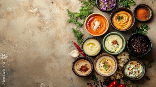 Traditional Eastern Dips with Fresh Ingredients in Natural Light