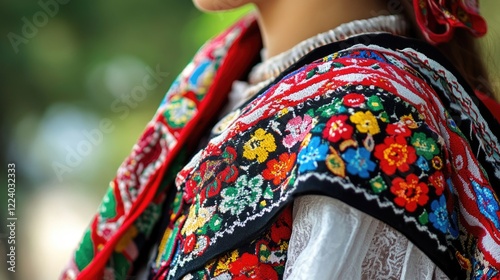 Traditional Eastern European Folk Costume Detail Featuring Colorful Floral Embroidery on Woman's Dress with Bright Red and Green Elements