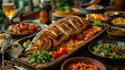 fish, dish, abundance, vegetable, presentation, seafood, dining, meal, epicure, table, cookery, fresh, colourful, healthy, eatery, platter, herb, tomatoes, corn, salad, grilled, feast, culinary, delicious, fish dish, sharing, family, friends, celebration, favor, spice, vibrant, seasonal, ingredient, traditional, cultural, receipe