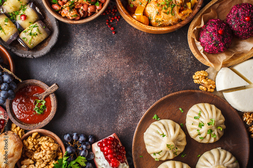 Traditional Georgian cuisine background. Khinkali, phali, chahokhbili, lobio, cheese, eggplant rolls, dark background.