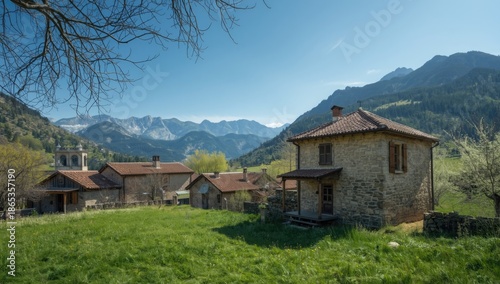 Traditional Greek village setting in Ampelakia Larissa Thessaly emphasizing historic buildings
