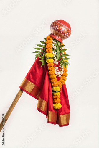 asian, indian, festival, celebration, hindu, new, year, traditional, culture, auspicious, pot, mango, leaf, garland, flower, bamboo, stick, purple, clothes, silk, drape, yellow, orange, background, festive, holiday, maharashtra, religious, spiritual, art, illustration, vector, design, banner, greeting, card, invitation, wallpaper, vibrant, colourful, symbolic, ritual, prosperity, joy