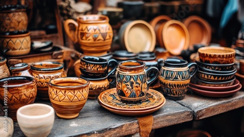 pottery, ceramic, handcraft, traditional, artisan, table, craft, design, hand-made, wood, brown, circle, clay, artistic, decoration, drink, kitchen, rustic, colours, texture, utensil, market, surface, sediment, vessel, unique, style, heritage, culture, craftsmanship, showcase, collection, round, bowl, mug, local, vibrant, warm, natural, art, beauty, display, interior