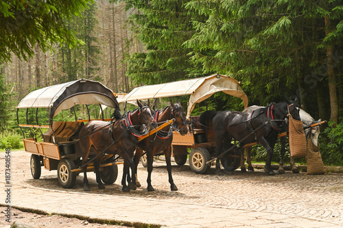 Traditional horse-drawn carriages standing on forest path surrounded by tall trees and natural woodland atmosphere. Horses harnessed to wooden tourist wagons waiting in shaded forest area.