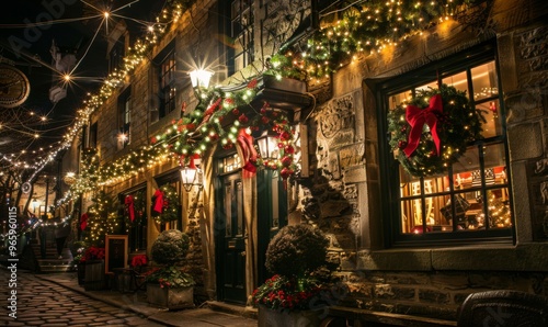 Traditional houses decorated with christmas garlands and lights
