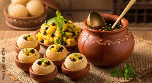 Traditional Indian Street Food Pani Puri Served in Rustic Clay Pots with Spicy Mint Water and Potato